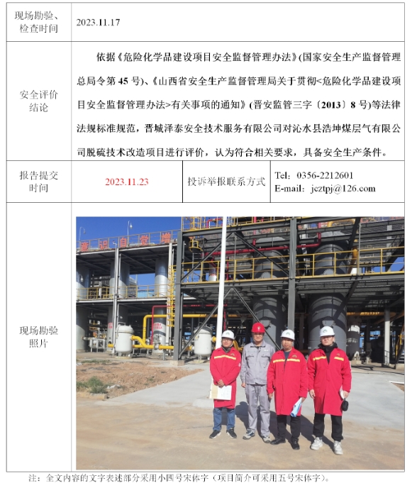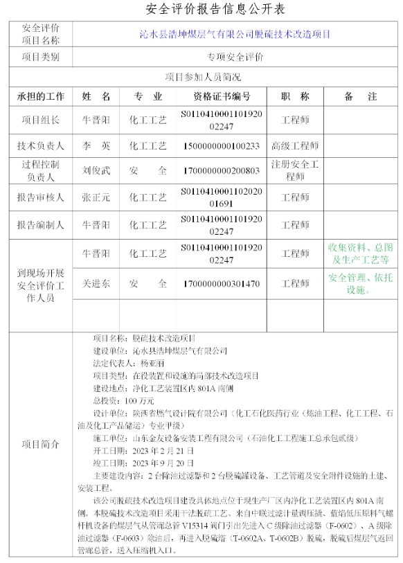 沁水縣浩坤煤層氣有限公司脫硫技術(shù)改造項(xiàng)目專(zhuān)項(xiàng)安全評(píng)價(jià)