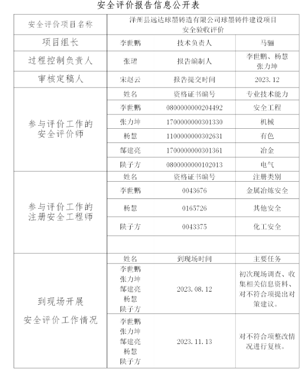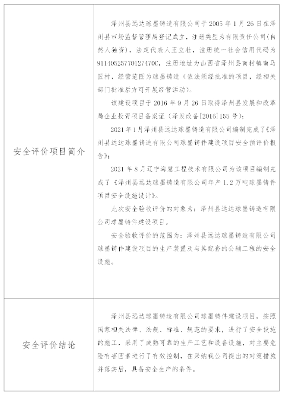 澤州縣遠(yuǎn)達(dá)球墨鑄造有限公司球墨鑄造件建設(shè)項目安全驗收評價