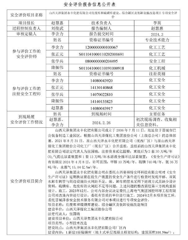 | 山西天澤集團(tuán)永豐化肥有限公司危廢庫(kù)和硫磺庫(kù)建設(shè)、綜合罐區(qū)及裝卸設(shè)施改造項(xiàng)目專項(xiàng)安全評(píng)價(jià) |