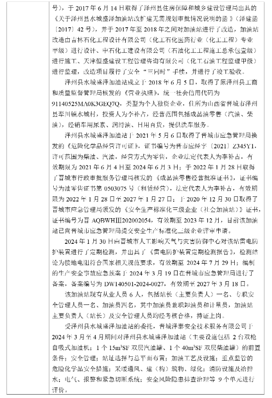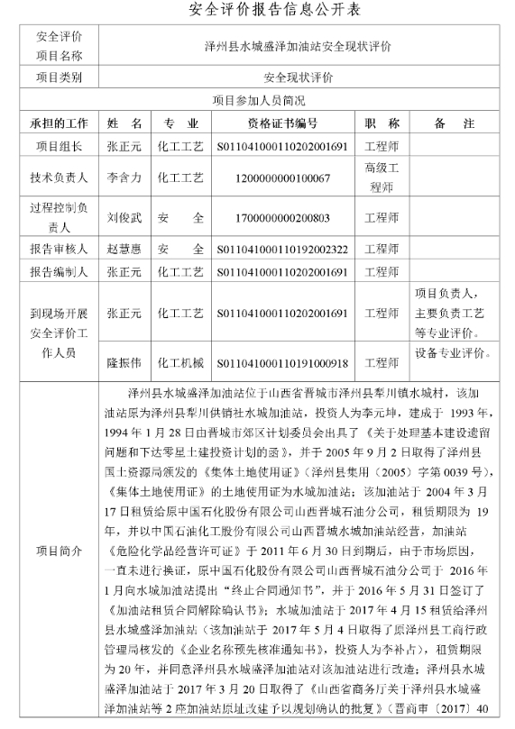 澤州縣水城盛澤加油站安全現(xiàn)狀評價