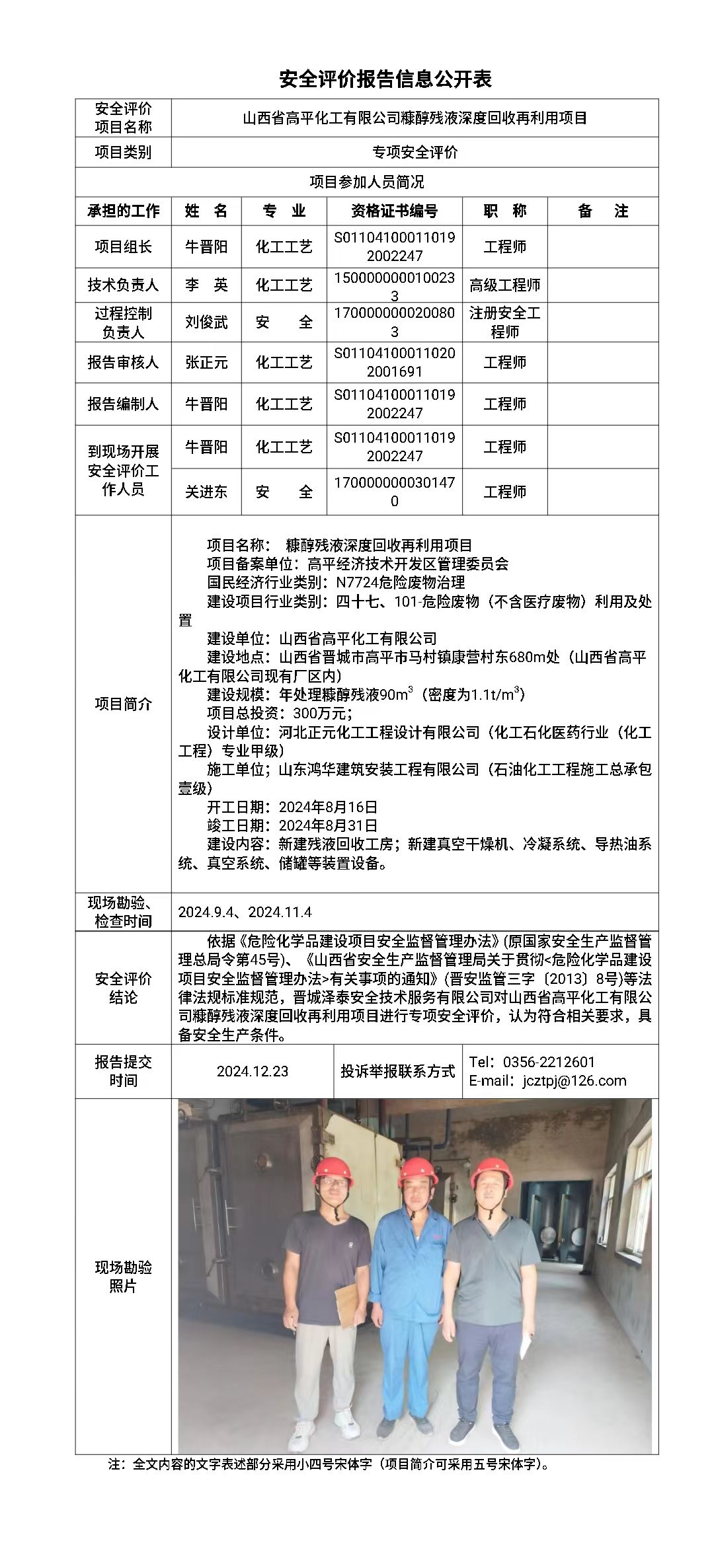山西省高平化工有限公司糠醇殘液深度回收再利用項目