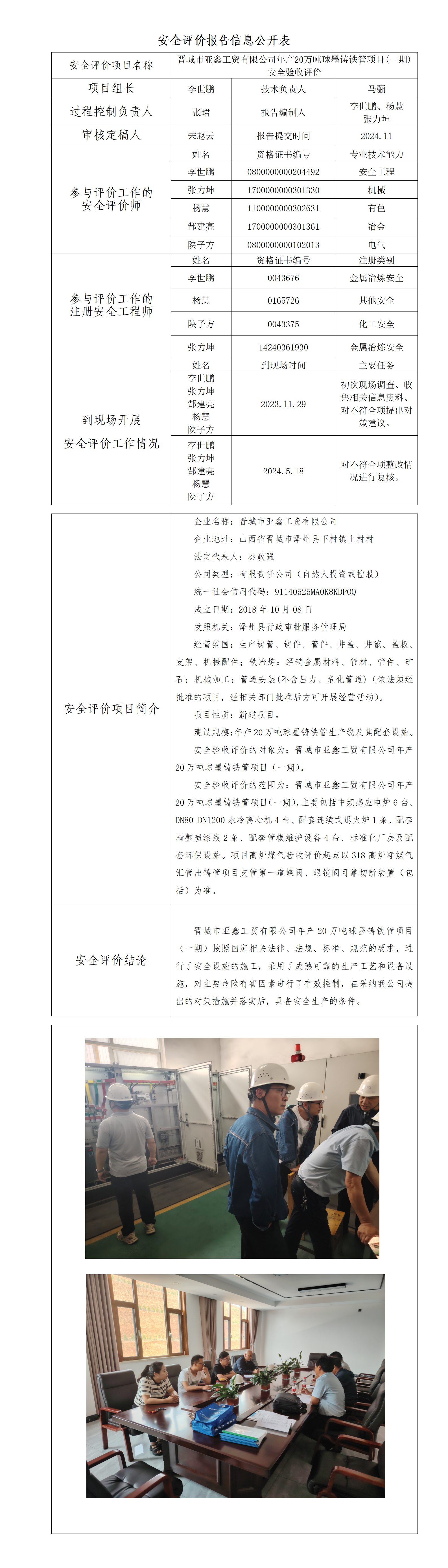 晉城市亞鑫工貿(mào)有限公司年產(chǎn)20萬(wàn)噸球墨鑄鐵管項(xiàng)目(一期) 安全驗(yàn)收評(píng)價(jià)
