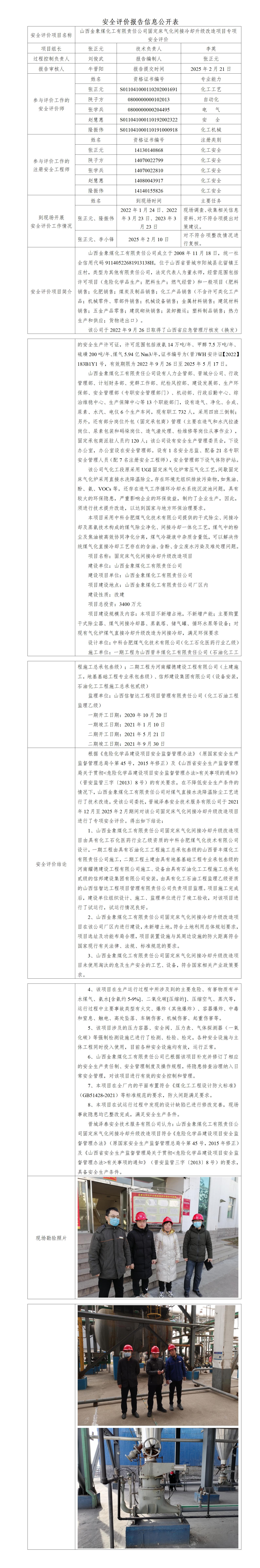山西金象煤化工有限責(zé)任公司固定床氣化間接冷卻升級(jí)改造項(xiàng)目專項(xiàng)安全評(píng)價(jià)