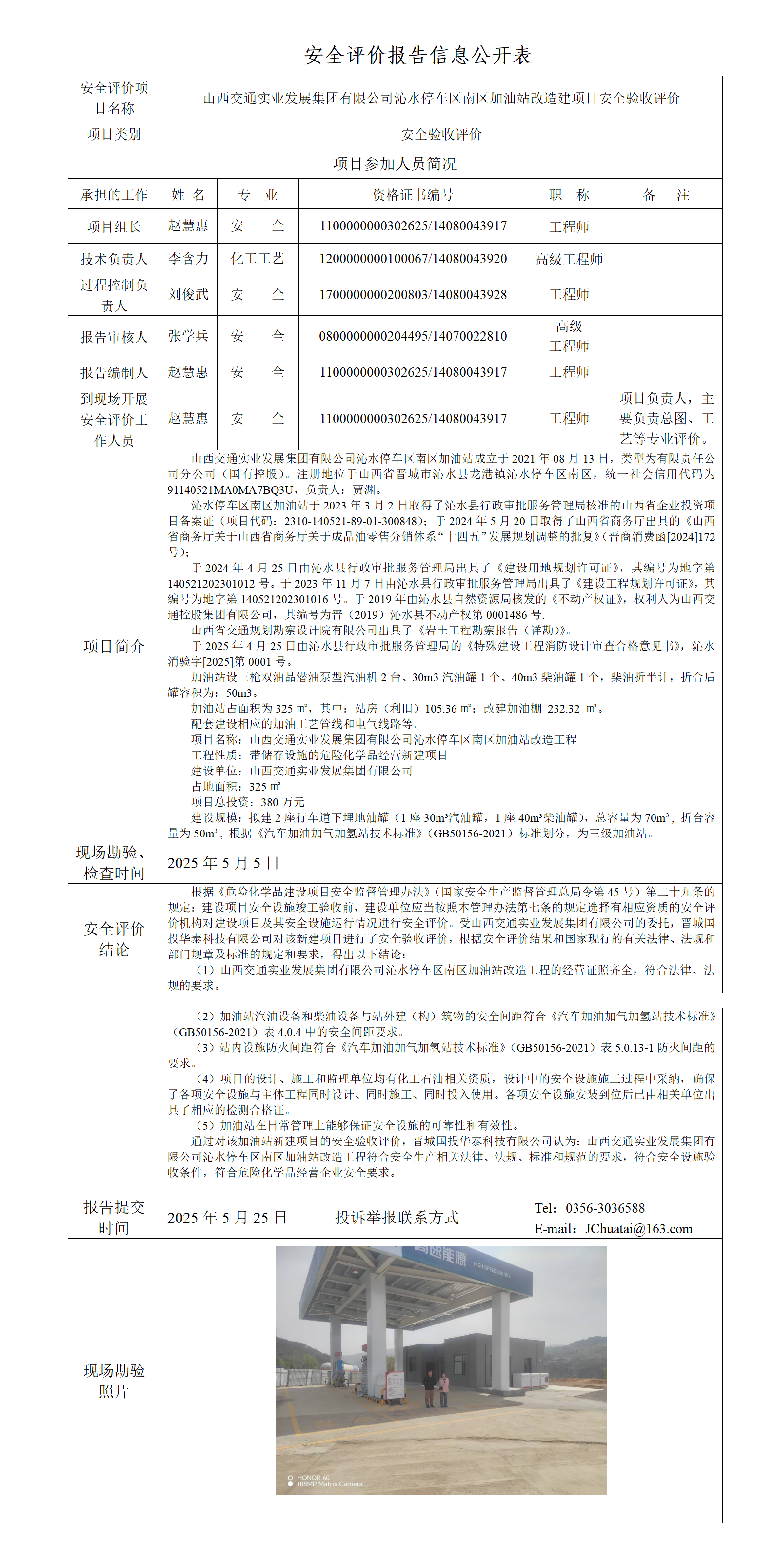 山西交通實(shí)業(yè)發(fā)展集團(tuán)有限公司沁水停車區(qū)南區(qū)加油站改造建項(xiàng)目安全驗(yàn)收評(píng)價(jià)