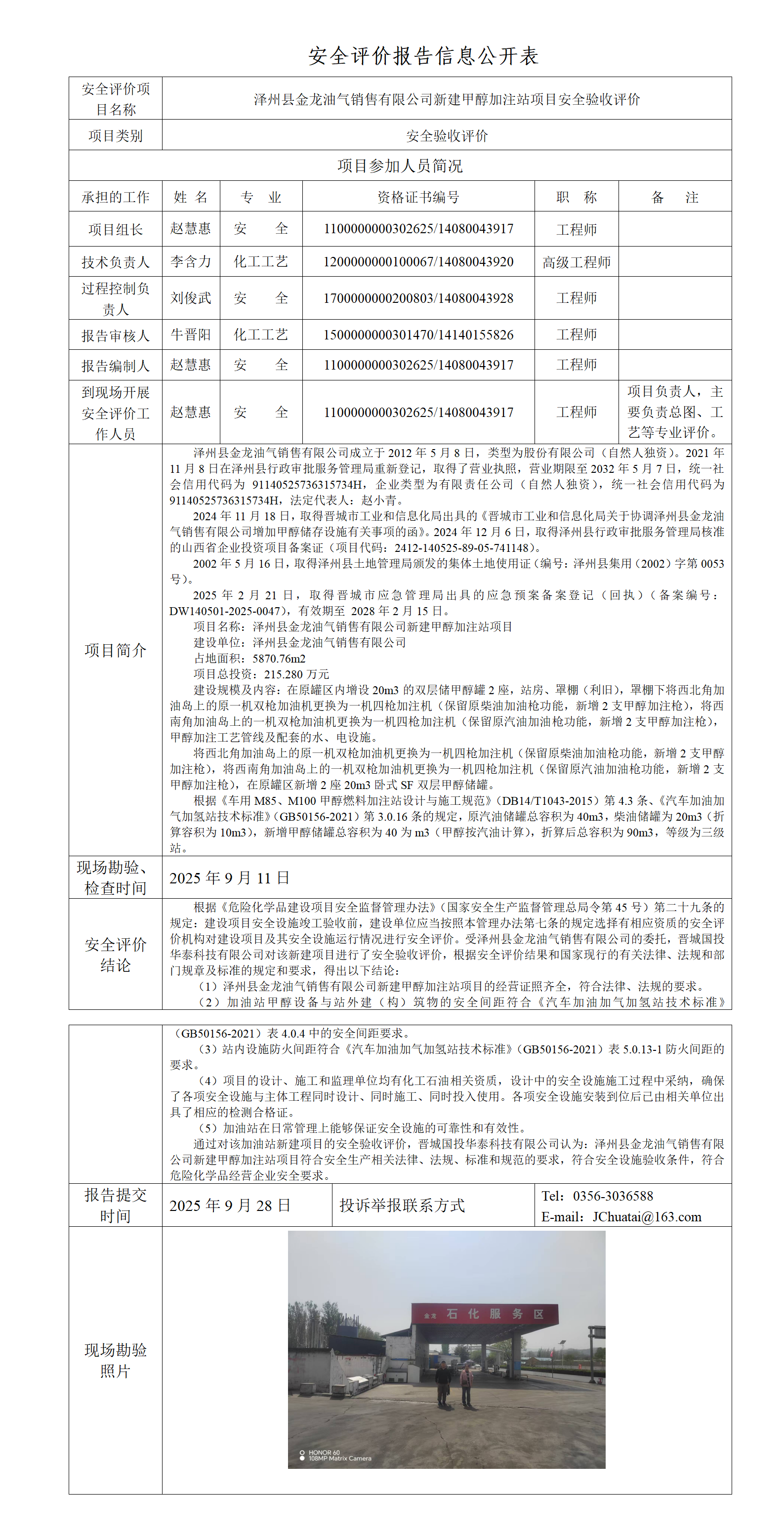 澤州縣金龍油氣銷售有限公司新建甲醇加注站項目安全驗收評價