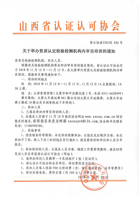 近期由山西省認證認可協會于2018年11月12日-15日在太原舉辦資質認定檢驗檢測機構內審員培訓;公司原有內審員5人到期,2人調崗;為確保工作順利開展,公司決定派出6人參加此次培訓。經過4天的培訓,公司6人都出色的完成了此次學習并通過考試,取得了內審員資格證書,進一步提升了自身能力。